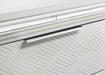 Add a touch of elegance to your bedroom with this spacious 9-drawer dresser, featuring a modern Italian design. The white finish, combined with picture framed recessed panels and embossed herringbone graphic patterns, creates a sophisticated look. Accented with mirror framing, acrylic legs, and polished chrome metal hardware, this dresser offers ample storage space. The top center drawer includes a removable jewelry tray, and all top drawers are felt-lined for added luxury. Crafted from Asian hardwood, MDF, and mirror, this dresser combines style and practicality.